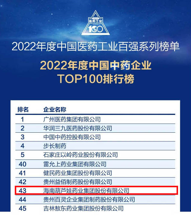 PG药业集团连续4年荣登“中国中药企业TOP100排行榜”,排名上升至第43位